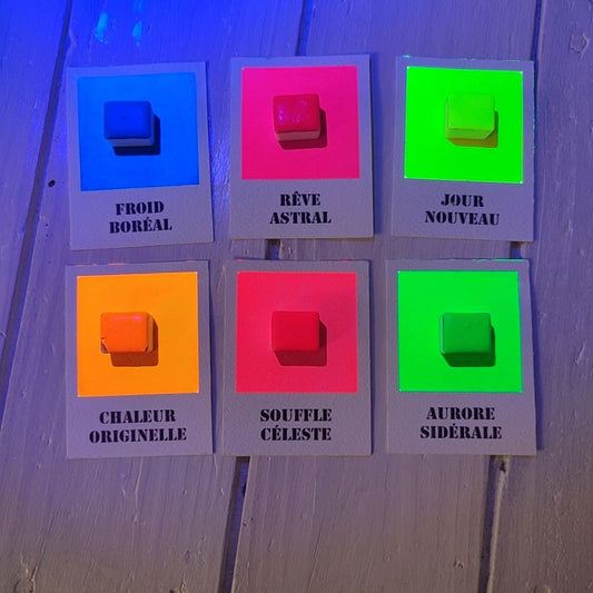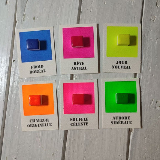 Chaque couleur est coulée en demi-godets généreux, avec des pigments haut de gamme et un mica éthique fourni par Le Comptoir du Mica.